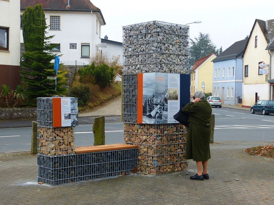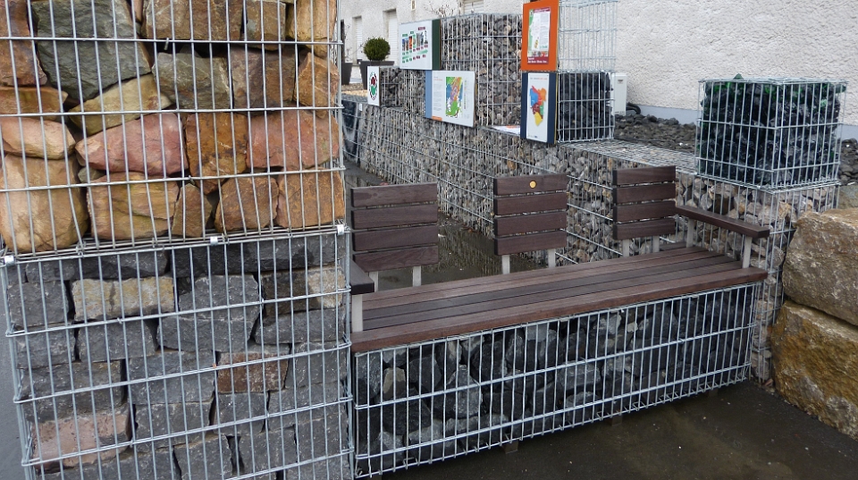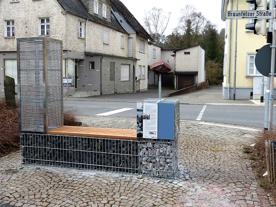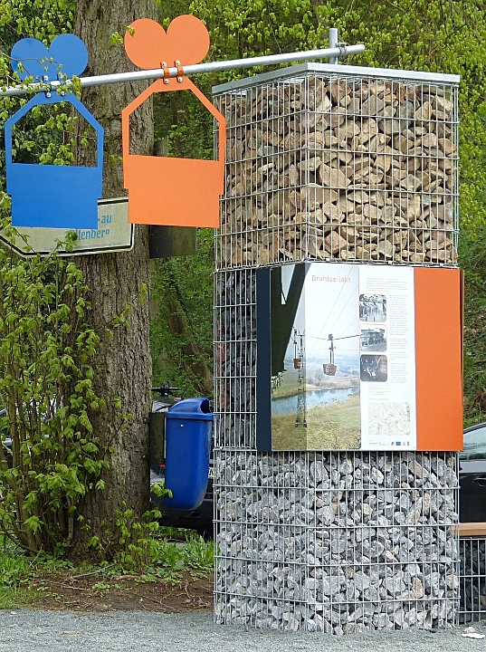 22 An unterschiedlichen Stellen in Solms (Albshausen, Burgsolms, Oberbiel und Oberndorf) wurden Elemente aufgestellt, die spielerlisch auf den lokalen Bezug hinweisen: an dieser Stelle etwa befand sich eine Drahtseilbahn, mit deren Hilfe die Steine aus einem Steinbruch abtransportiert wurden.