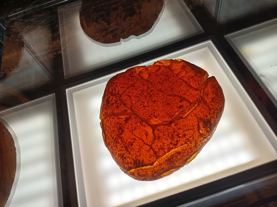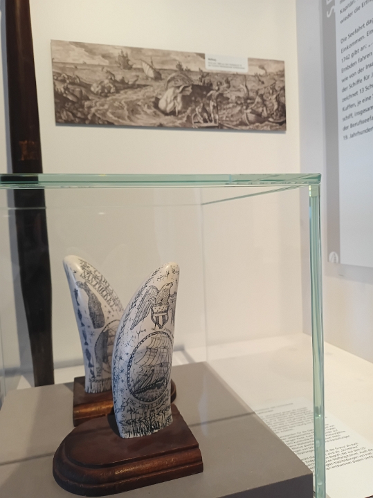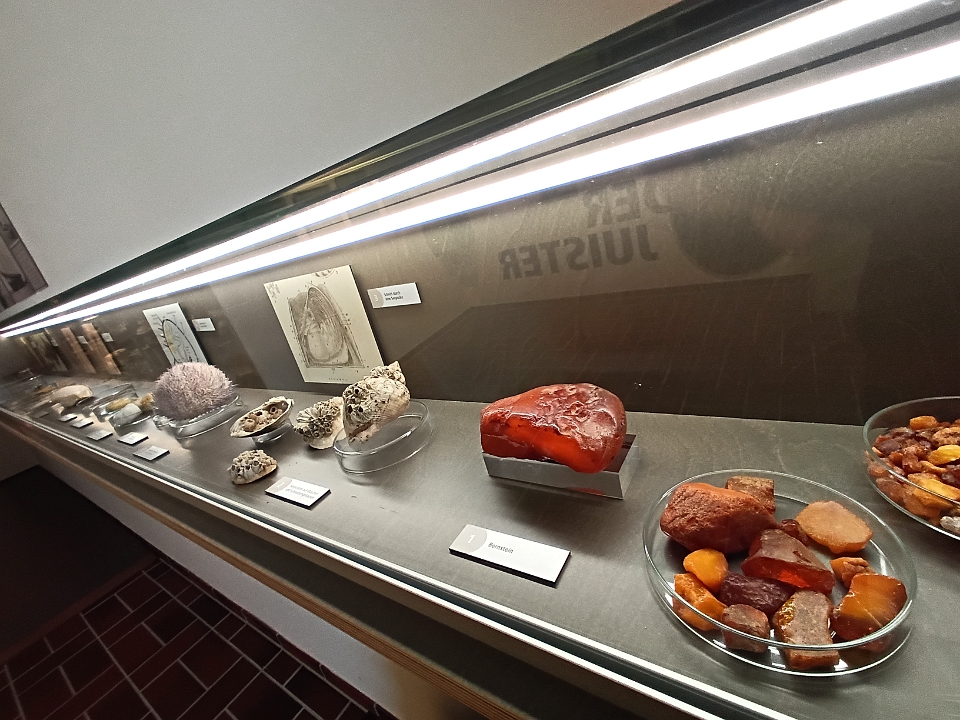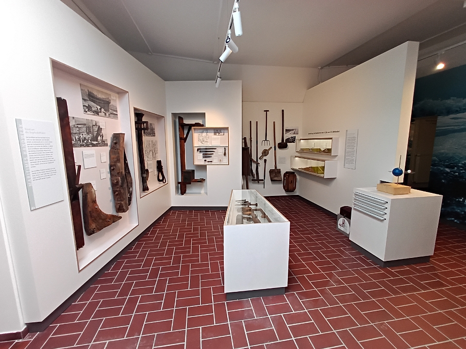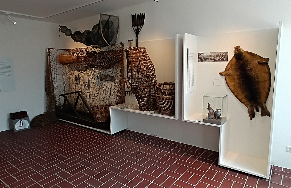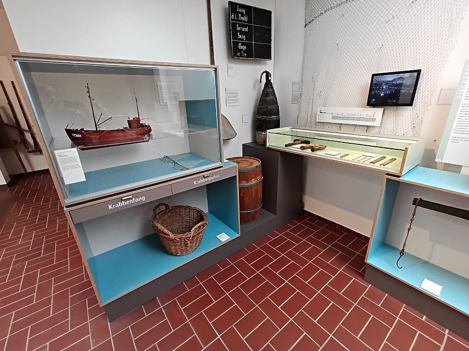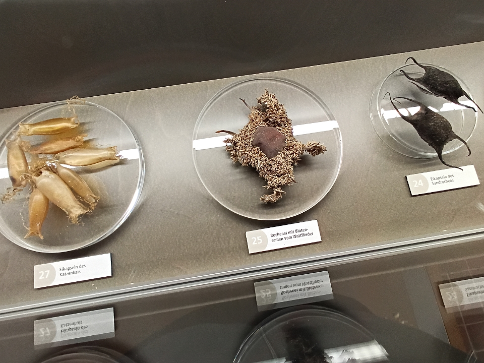 55 An der Wand entlang werden in einer Vitrinen die Naturschätze der Nordsee präsentiert.