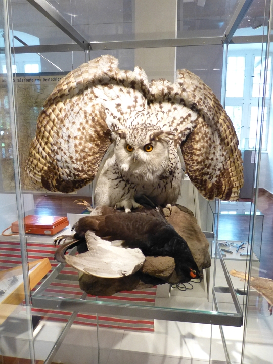 8 Der sibirische Uhu mit erlegtem Birkhuhn entfaltet in einer Drohgebärde sein Gefieder
